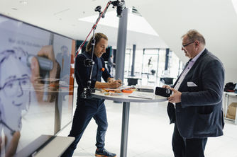 Der Zeichenprozess wird per Videokamera auf einem großen Display übertragen, so kann live dabei zugeschaut werden, wie in wenigen Minuten das Portrait entsteht.